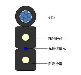 自承式接入網(wǎng)用蝶形引入室內(nèi)光纜是將光通信單元處于中心,兩側(cè)放置兩根平行非金屬加強(qiáng)元件(FRP),在外側(cè)再附加一根鋼絲加強(qiáng)元件,最后,擠制黑色或彩色低煙無(wú)鹵護(hù)套成纜。
