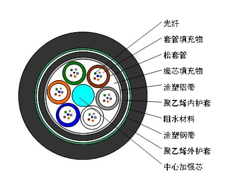GYTA53光纜的結(jié)構(gòu)是將250µm光纖套入高模量材料制成的松套管中,松套管內(nèi)填充防水化合物。纜芯的中心是一根金屬加強芯,對于某些芯數(shù)的光纜來說,金屬加強芯外還需擠上一層聚乙烯(PE)。松套管(和填充繩)圍繞中心加強芯絞合成緊湊和圓形的纜芯,纜芯內(nèi)的縫隙充以阻水填充物。涂塑鋁帶(APL)縱包后擠一層聚乙烯內(nèi)護套,雙面涂塑鋼帶(PSP)縱包后擠制聚乙烯護套成纜。